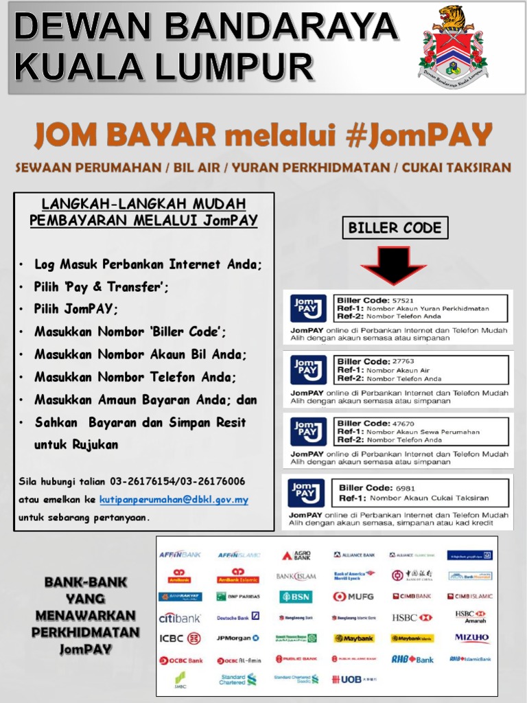 ONE STOP CENTER. Fee payable by Biller. JomPAY online at Internet and Mobile Banking with your Current or Saving account.