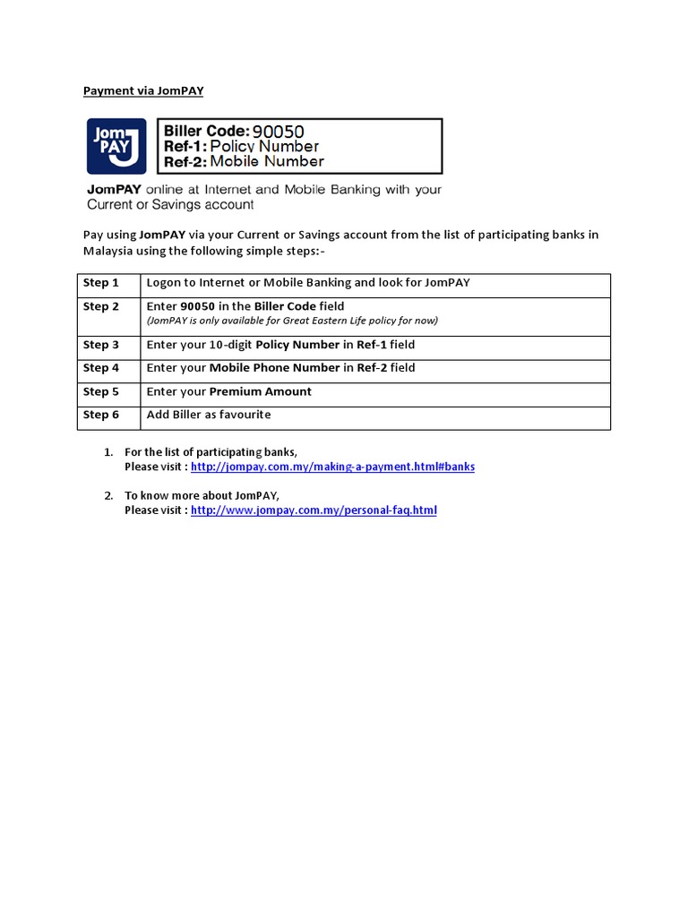 Step 2 Enter 90050 in the Biller Code field JomPAY is only available for Great Eastern Life policy for now Step 3 Enter your 10-digit Policy Number in Ref-1 field Step 4 Enter your Mobile Phone Number in Ref-2 field Step 5 Enter your Premium Amount Step 6 Add Biller as favourite 1. JomPAY Transaction means the successful bill or invoice payments of a minimum of RM10 to a JomPAY Biller via JomPAY. GO ONLINE Login to Maybank2u select Pay Transfer select Pay ATM.